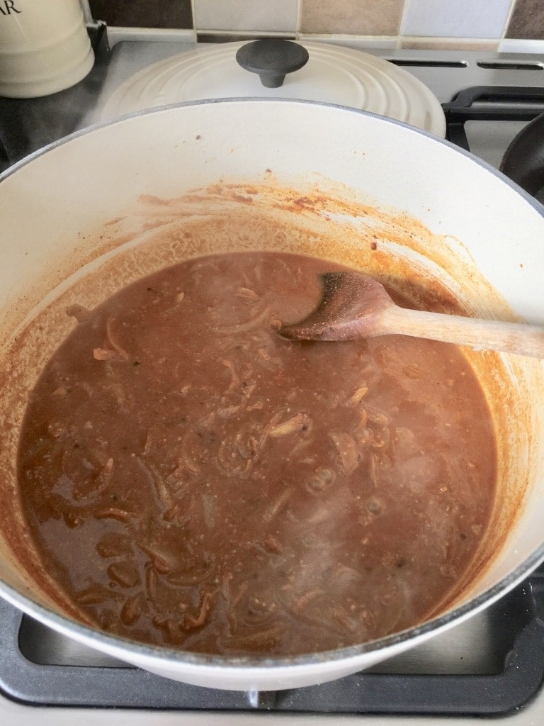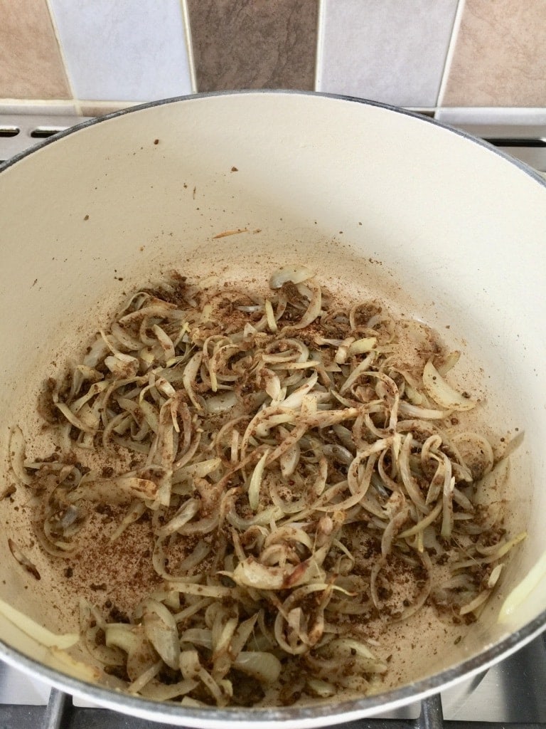 - Melt the butter in a large saucepan, add sliced onions and the remaining half of the spice mix then fry gently for good 10-15 minutes until onions start getting soft.