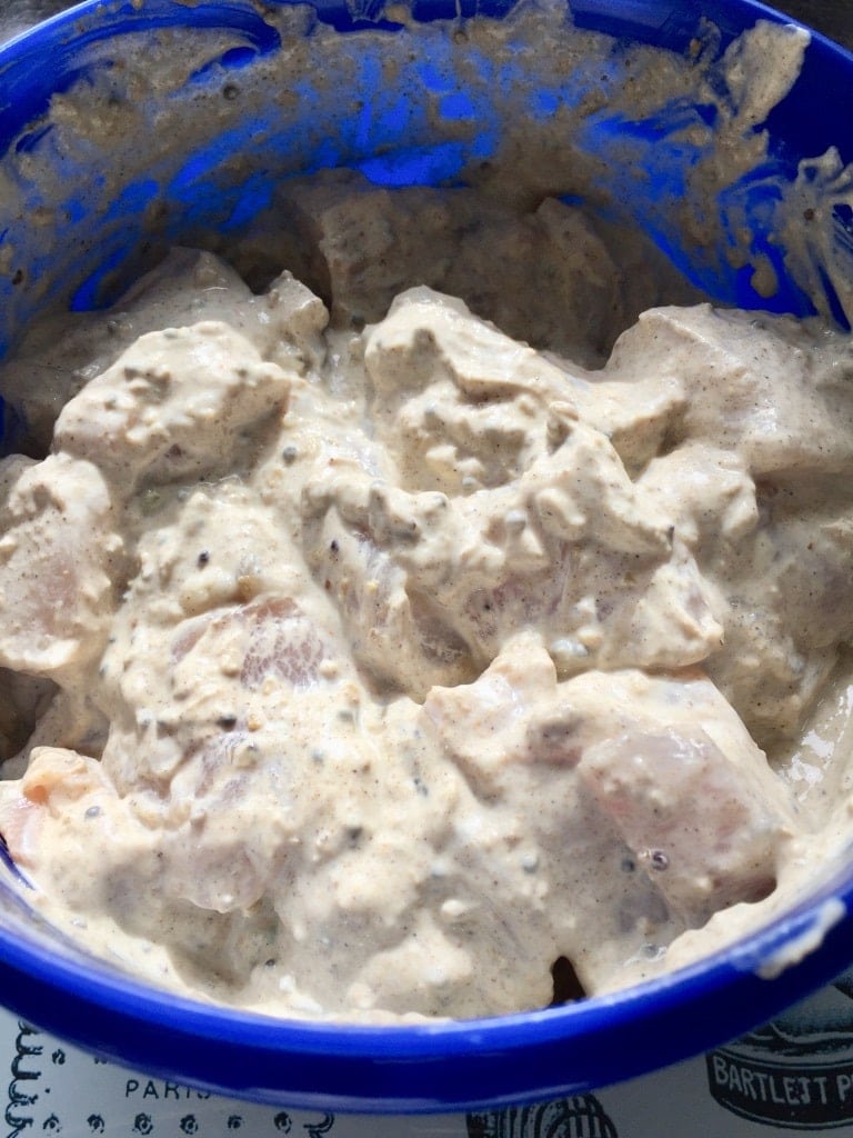- Once your mix is ready, put half of it aside and mix another half with yoghurt. This is your marinade. Mix it with chicken chunks and set aside for minimum half an hour but the longer the better.