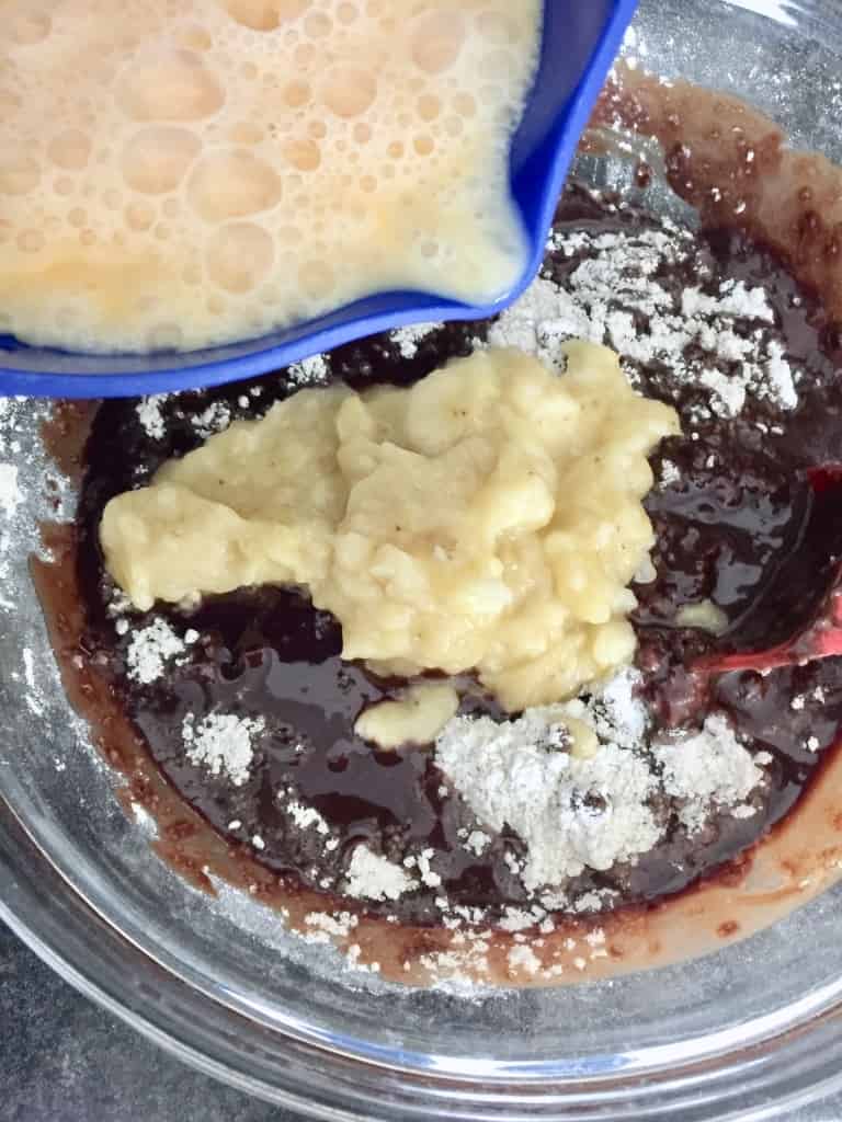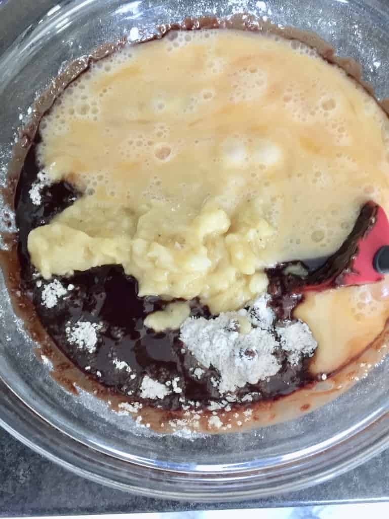 Chocolate Banana Cake - melted chocolate mixture added to the flour and sugar