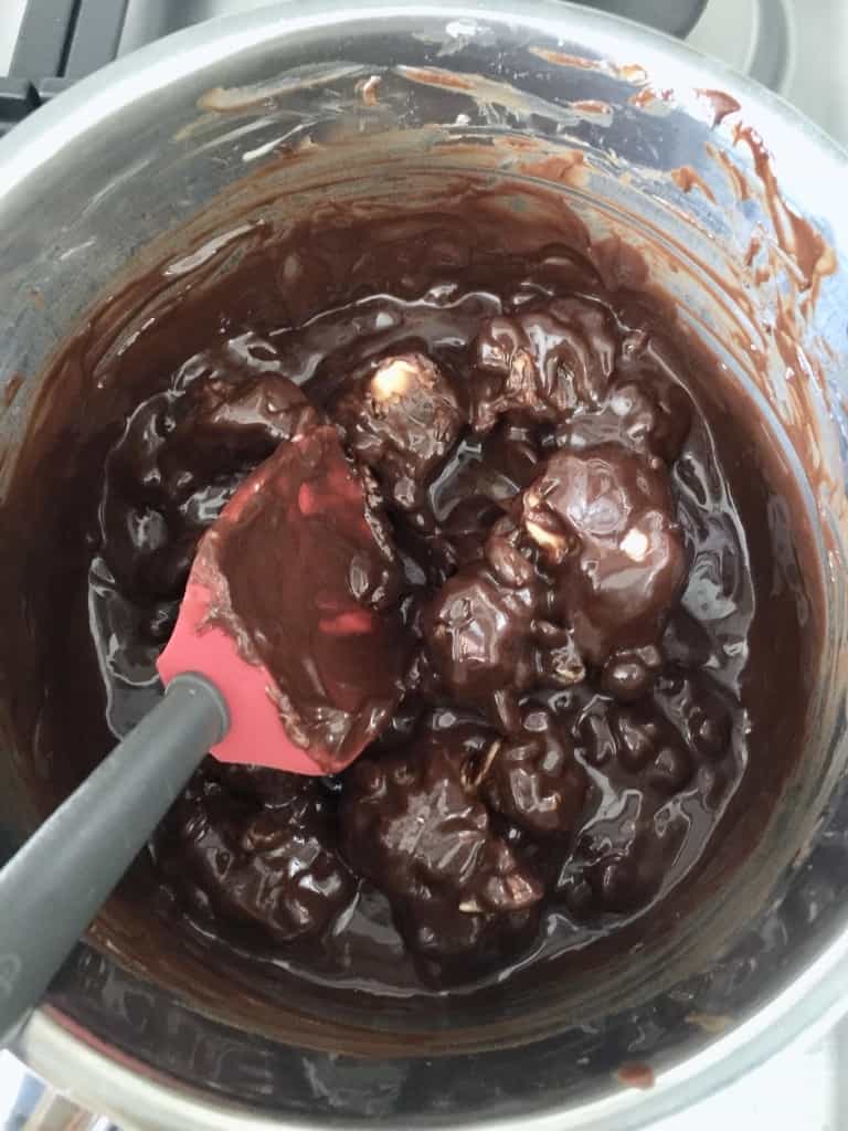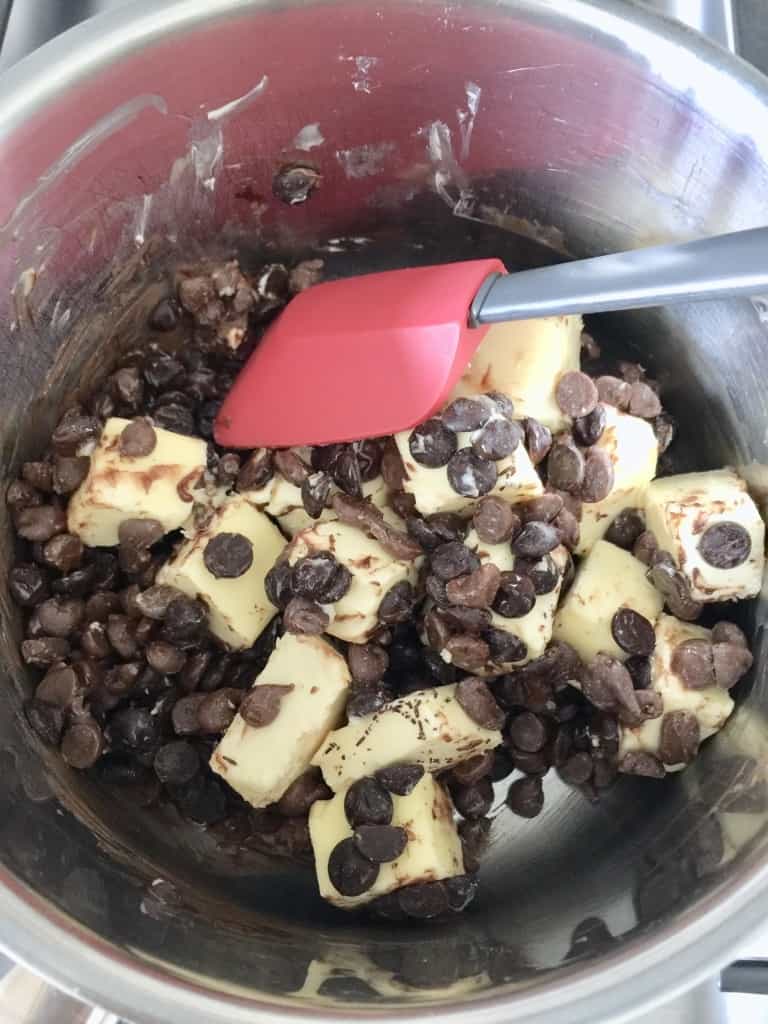 • Put butter/spread and chocolate (roughly chopped unless you are using chocolate chips) in a medium saucepan and put on a low heat.