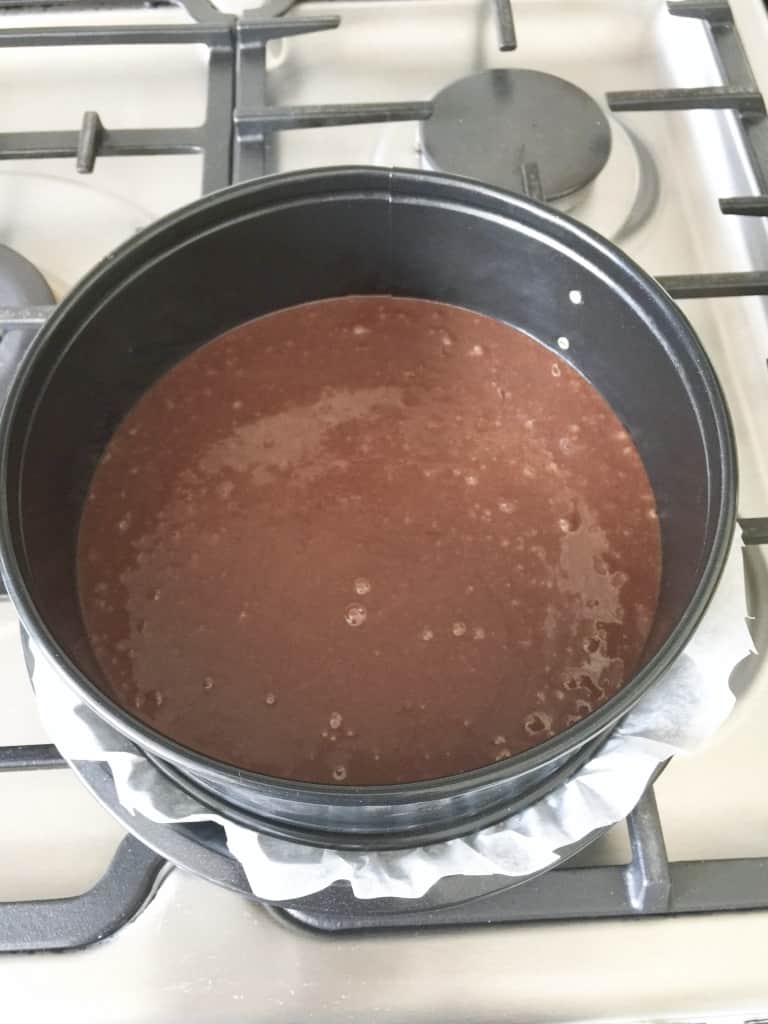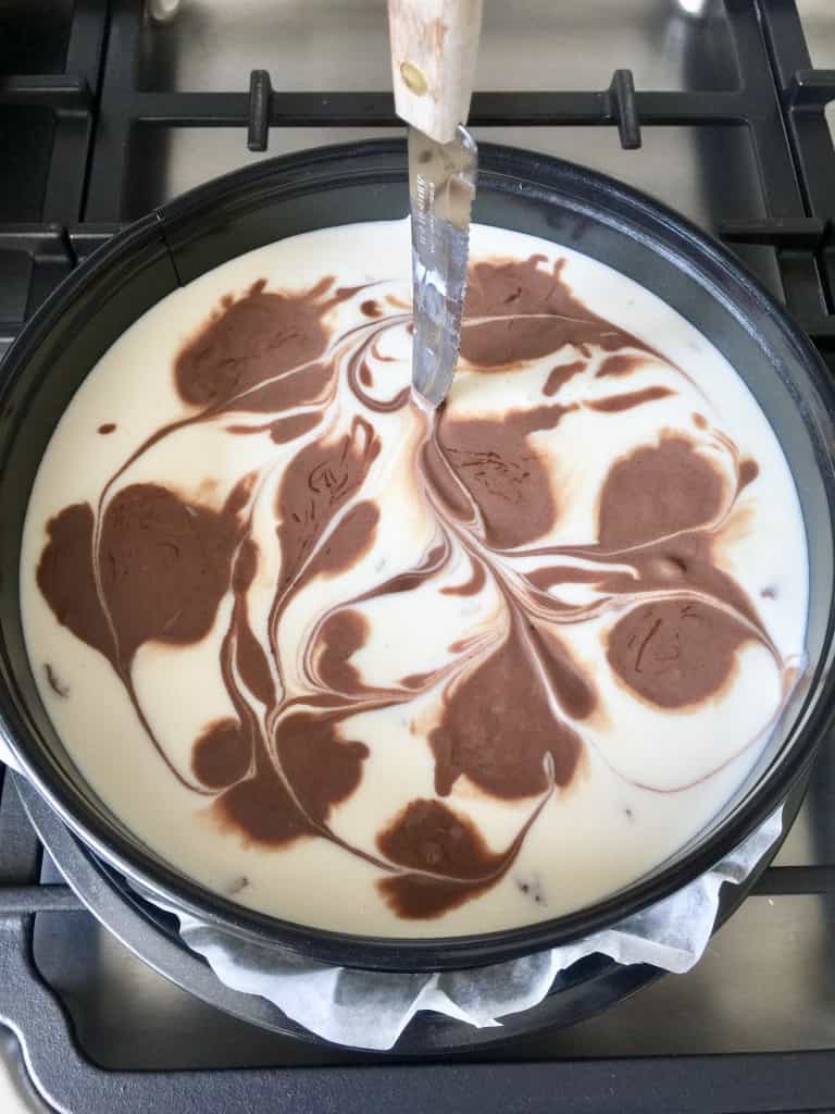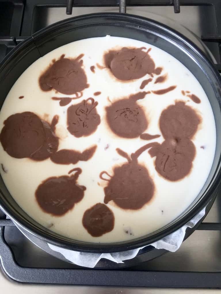 - Mix the remaining cup of cheesecake mixture with melted chocolate and put in blobs onto the cheesecake already in the tin. With the end of the knife create swirls all over the mixture which will give you marble effect once baked.