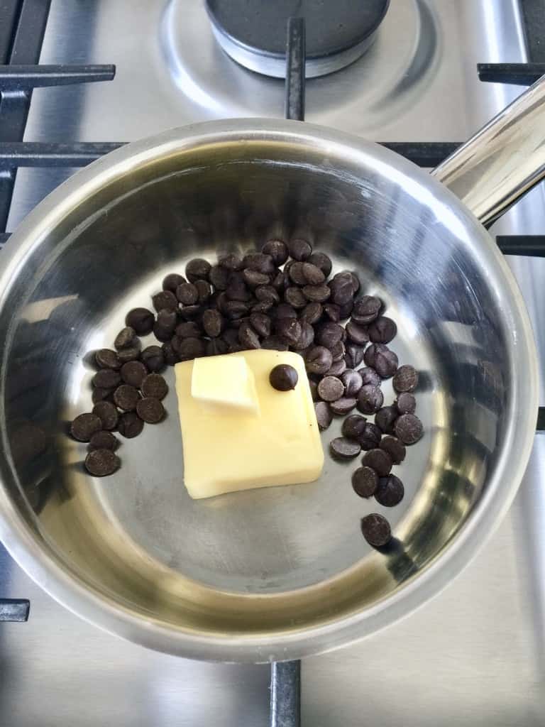 - Start with melting butter and chocolate in a small pan over low heat until smooth and glossy. Make sure you keep stirring to prevent them from burning. Set aside and let it cool a little.