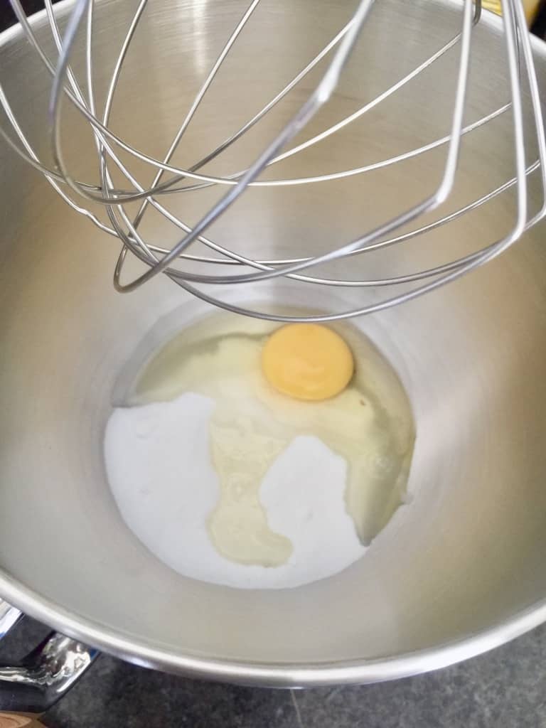 - Mix sugar and egg in a food processor until pale and fluffy (use egg beater attachment). You can also do it by hand or with hand held mixer.