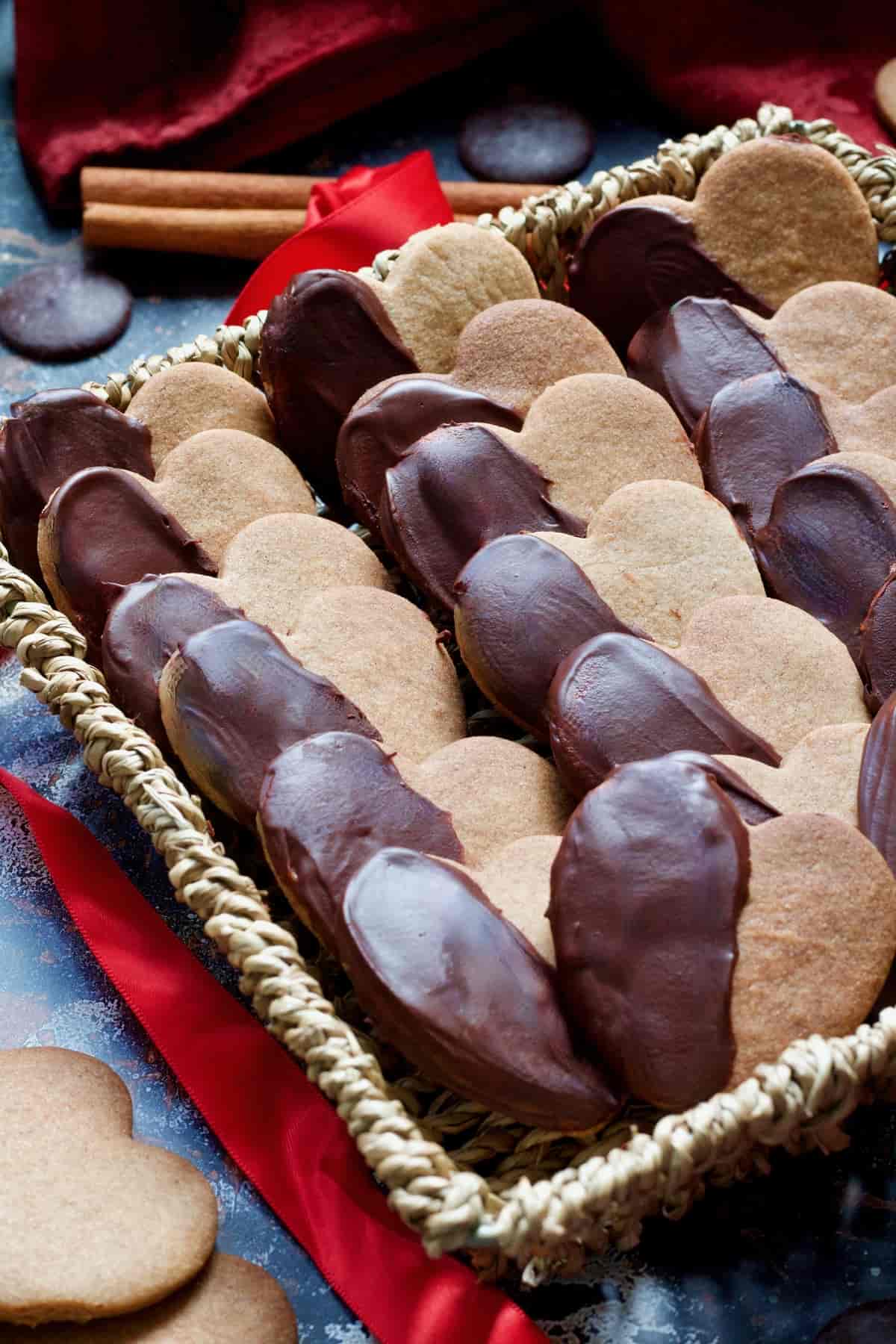 Heart shaped, cinnamon cookies dipped in chocolate in a basket.