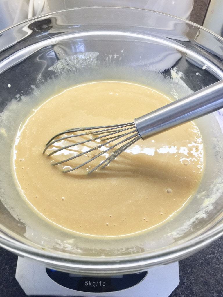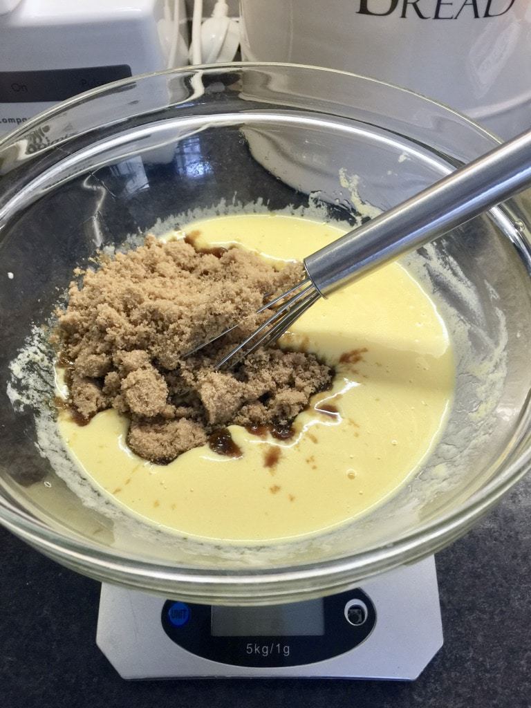 • Put yogurt, eggs and oil in a large bowl and give them a good whisk. Add brown sugar and whisk until nice and smooth (the mixture will be the colour of caramel). Set aside.