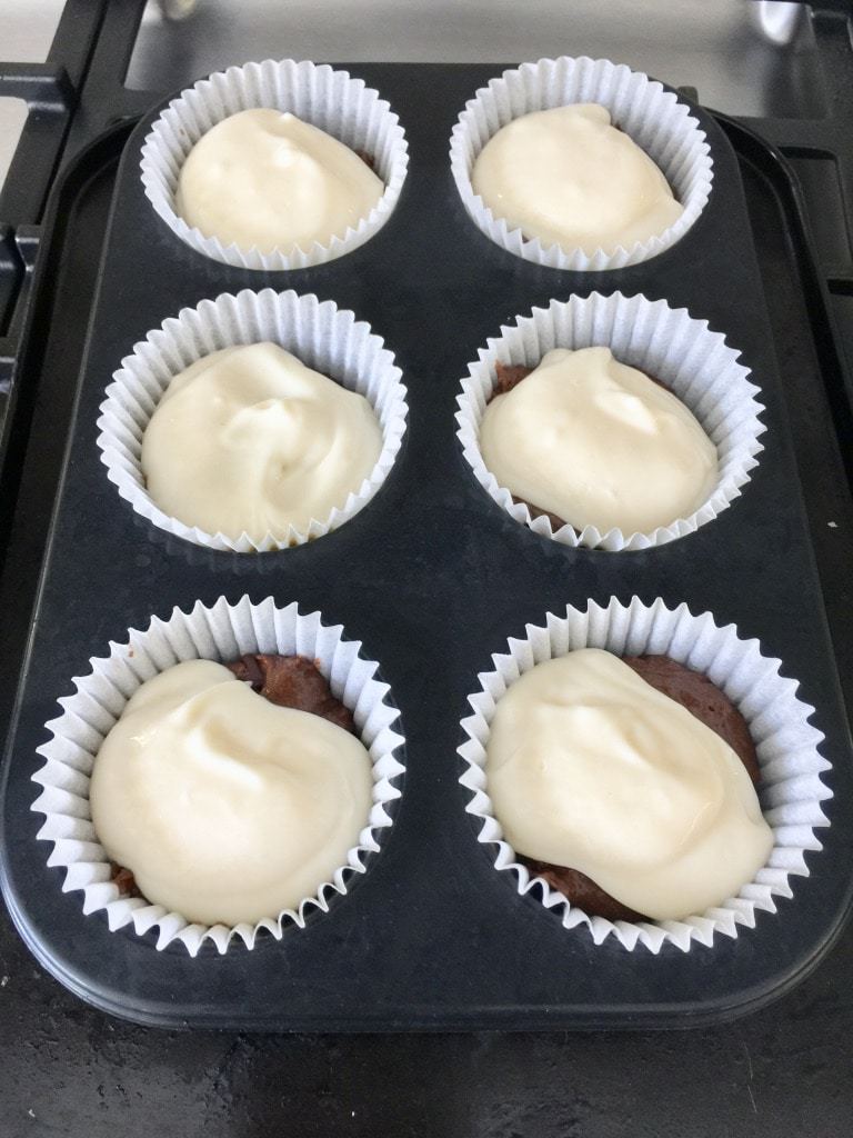 • Preheat the oven to 180C/350F/Gas Mark 4. Fill 12 muffin cases half way up with chocolate muffin batter. Follow with cream cheese mixture (divide it evenly in between 12 muffin cases - approx. 2 heaped teaspoon per muffin). Follow with a small dollop of remaining chocolate batter mixture on top of cheese mixture. You can bake these as they are or using a toothpick swirl cheese and chocolate mixture around a bit. Bake for 20-25 minutes until the skewer inserted in the centre of the muffins comes out clean. Remove to the cooling rack to cool completely and enjoy!
