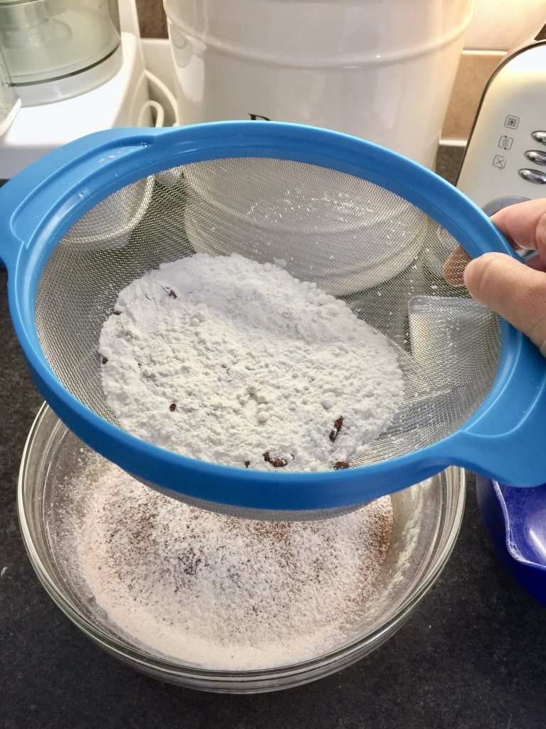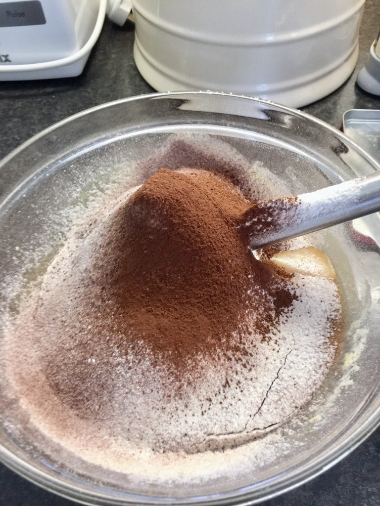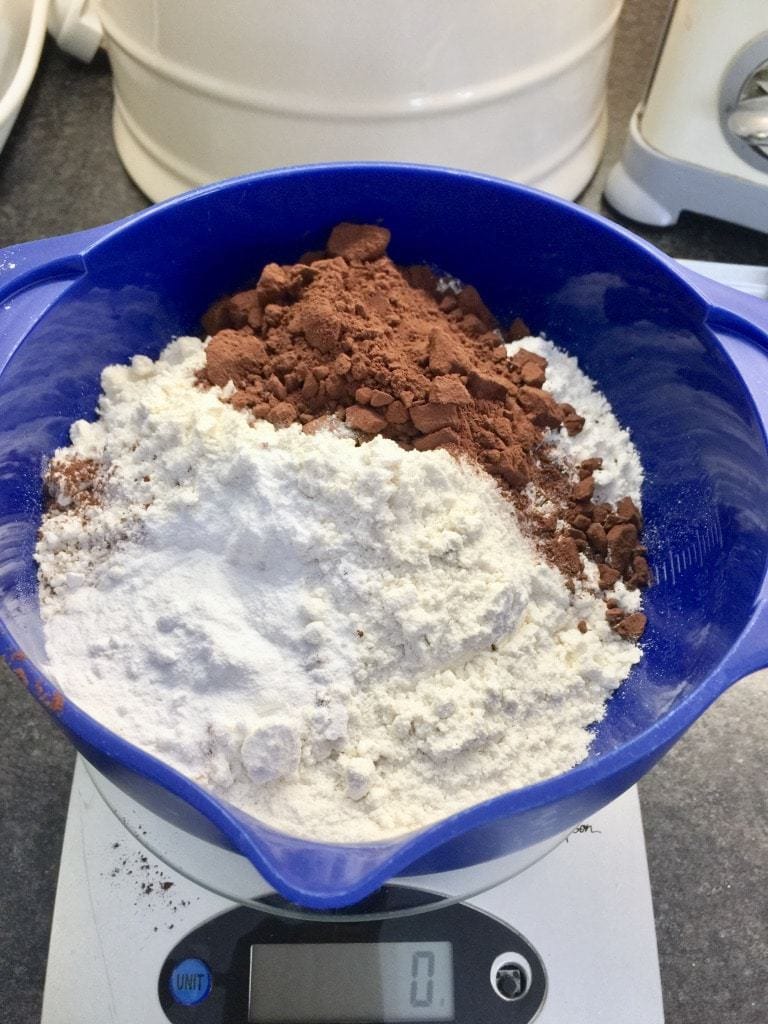 • In another bowl weigh out all your dry ingredients (flour, cocoa and baking powder). Sift these directly onto the wet ingredients and mix in gently only until all the dry ingredients are fully incorporated (do not overmix). Add chocolate chips and fold them in gently.