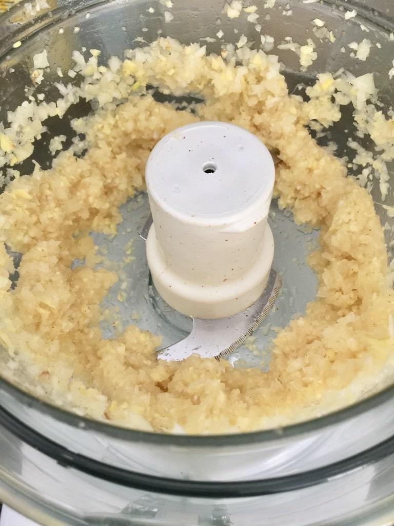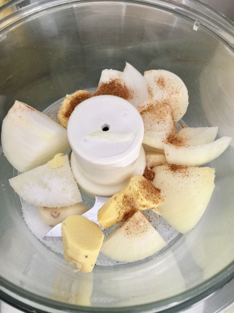 - Put your onion, garlic cloves, ginger, sugar and chilli powder in the food processor/blender and whizz together until you have almost paste like consistency. You can also chop the onion really finely and grate garlic and ginger using very fine grater if you don't have a food processor.