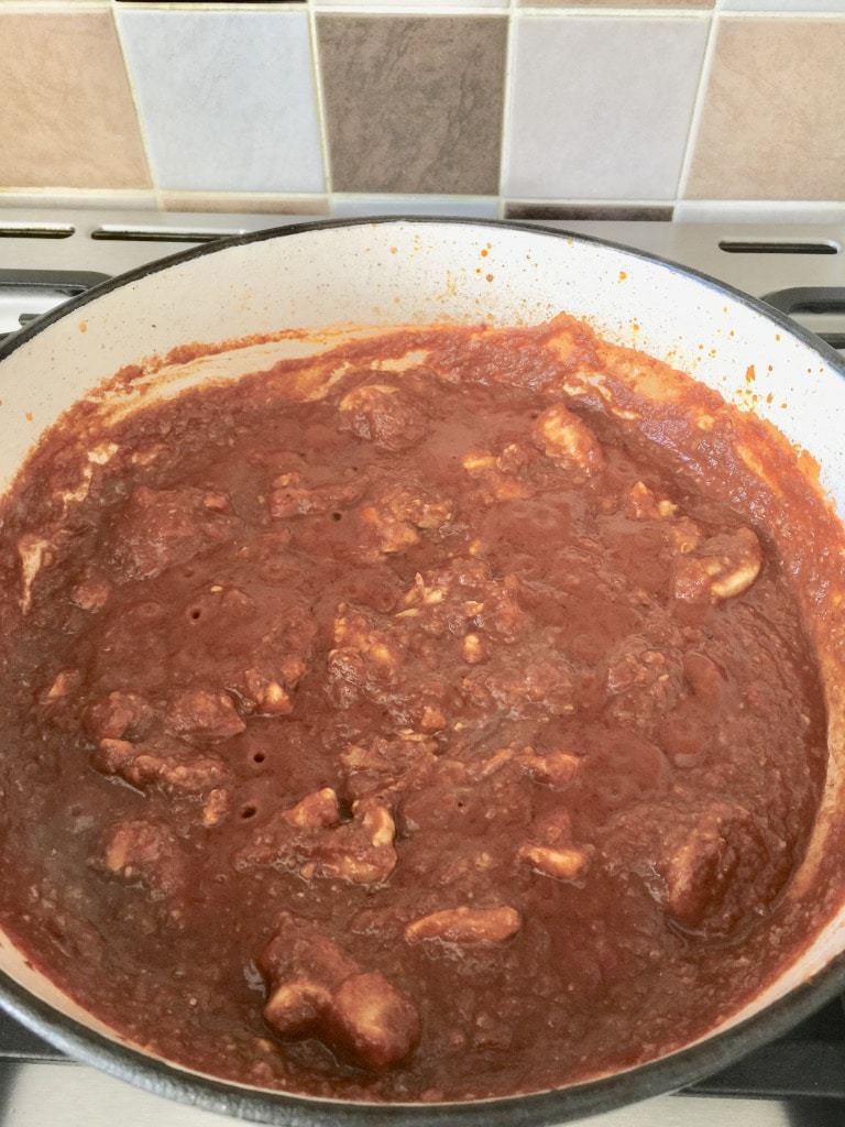 - Add chicken pieces, stir well, cover the pan with the lid and simmer for 10 min. Make sure you check on it and give it a stir/add a bit of water if sauce is getting too thick.