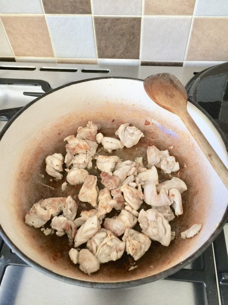 - Heat up half the butter (ghee) in a heavy, cast iron type pan with the lid and add your chicken pieces. Fry them for approx. 5 min until browned (you might want to do it in batches). Take chicken pieces out onto a plate using a slotted spoon.