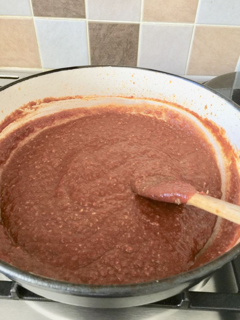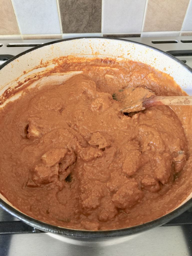 - Melt another half of butter and add your onion mixture. Let it fry for a couple of minutes at which point you add your passata followed by remaining spices (garam masala, cumin and ground coriander) and couple of glugs of water. Give it a good stir and let it come back to simmer.