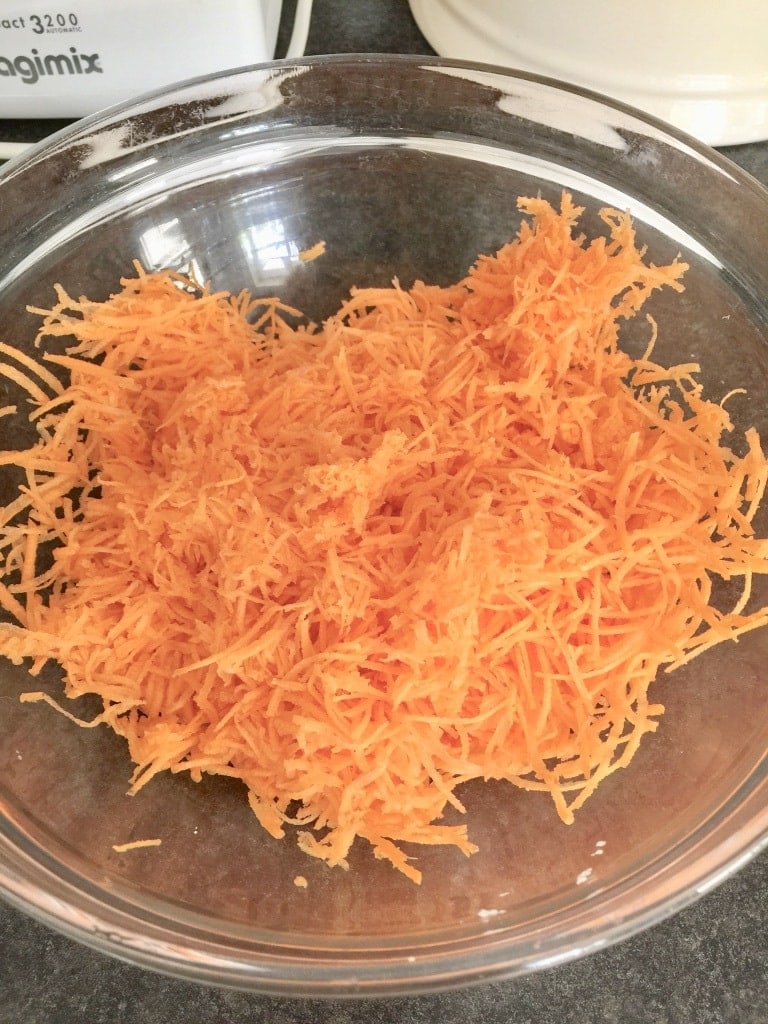 - Peel the carrots and grate them on a fine to medium side of your grater. You want nice and fine strands of carrots. Set aside.