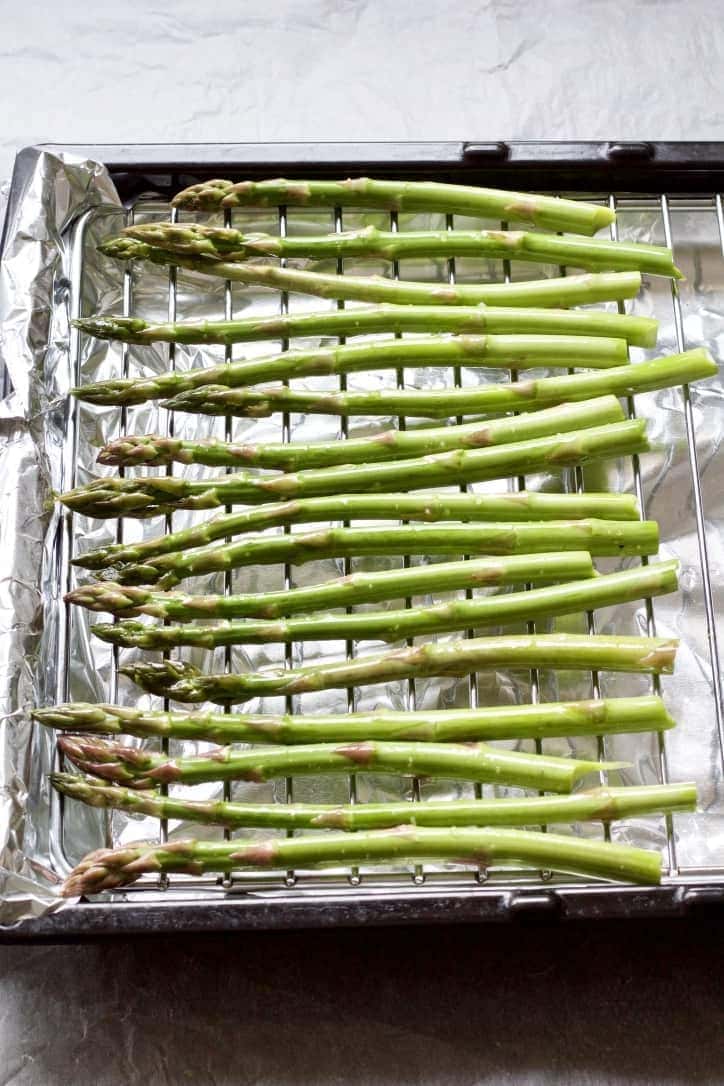 - Use grill rack if possible - I found that roasting asparagus on the top of the grill rack sat in the baking tray, roasted the spears quicker and more evenly than simply laying them in the baking dish. Whichever way you choose make sure you lay the spears in single layer!