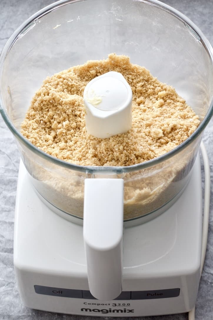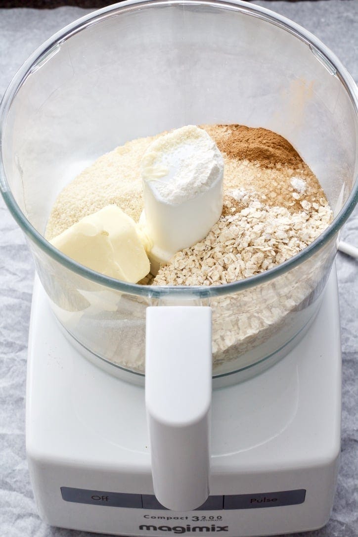 - If you are using food processor add all the ingredients and pulse gently until you get crumbs like consistency. You can also make this toppping by hand by putting all the ingredients with the exception of butter/spread into a large bowl and giving them a good mix. Add grated cold buter or chunks of baking sperad and work it into the flour mixture until you get crumbs like consistency.