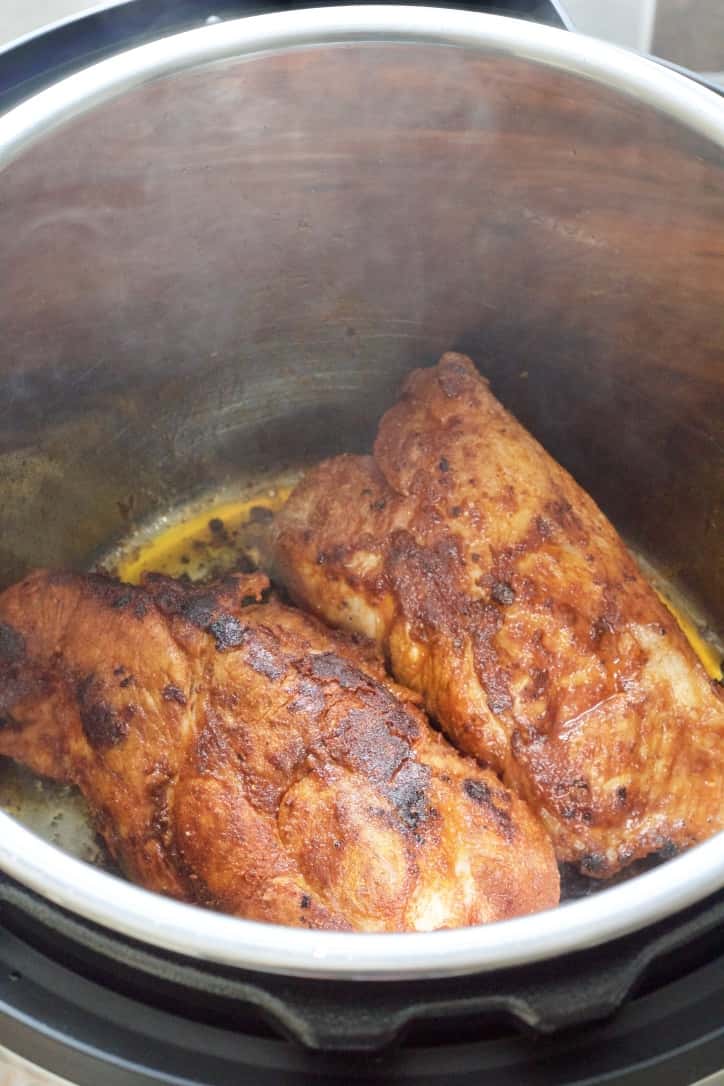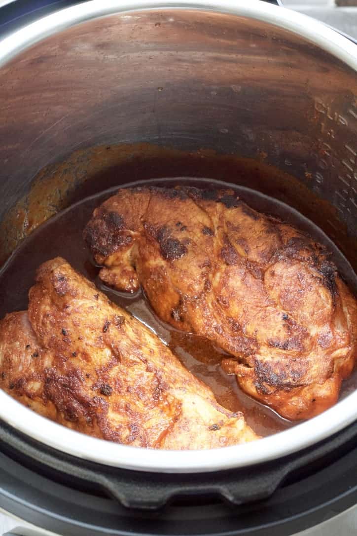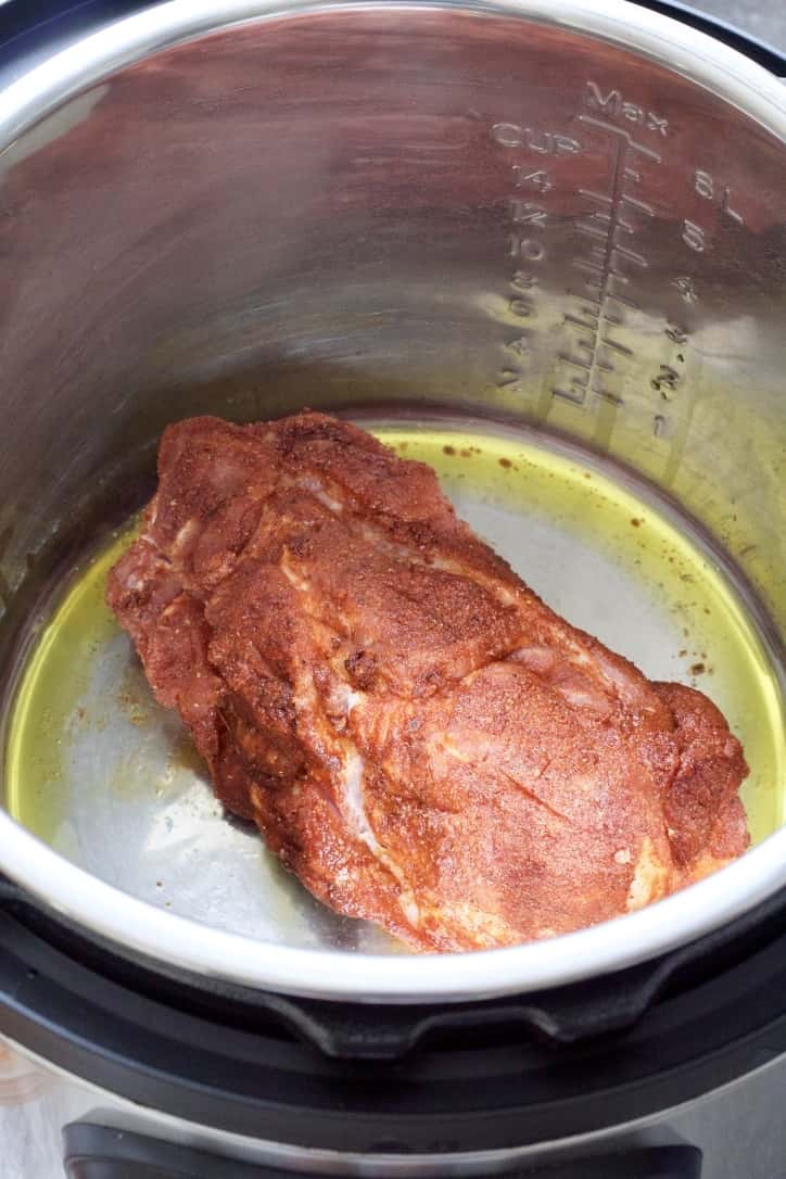 - Put 2 tablespoon of oil in your Instant Pot and press "Sauté" function button which should be set to High. Sear your pork pieces on all sides for a few minutes until nicely browned (you might want to do this in batches).