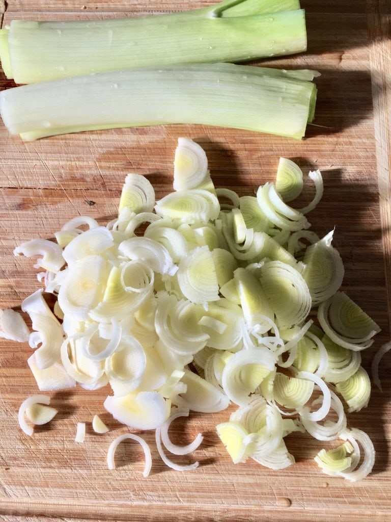 - 1 large leek (white and light green part) cleaned and thinly sliced