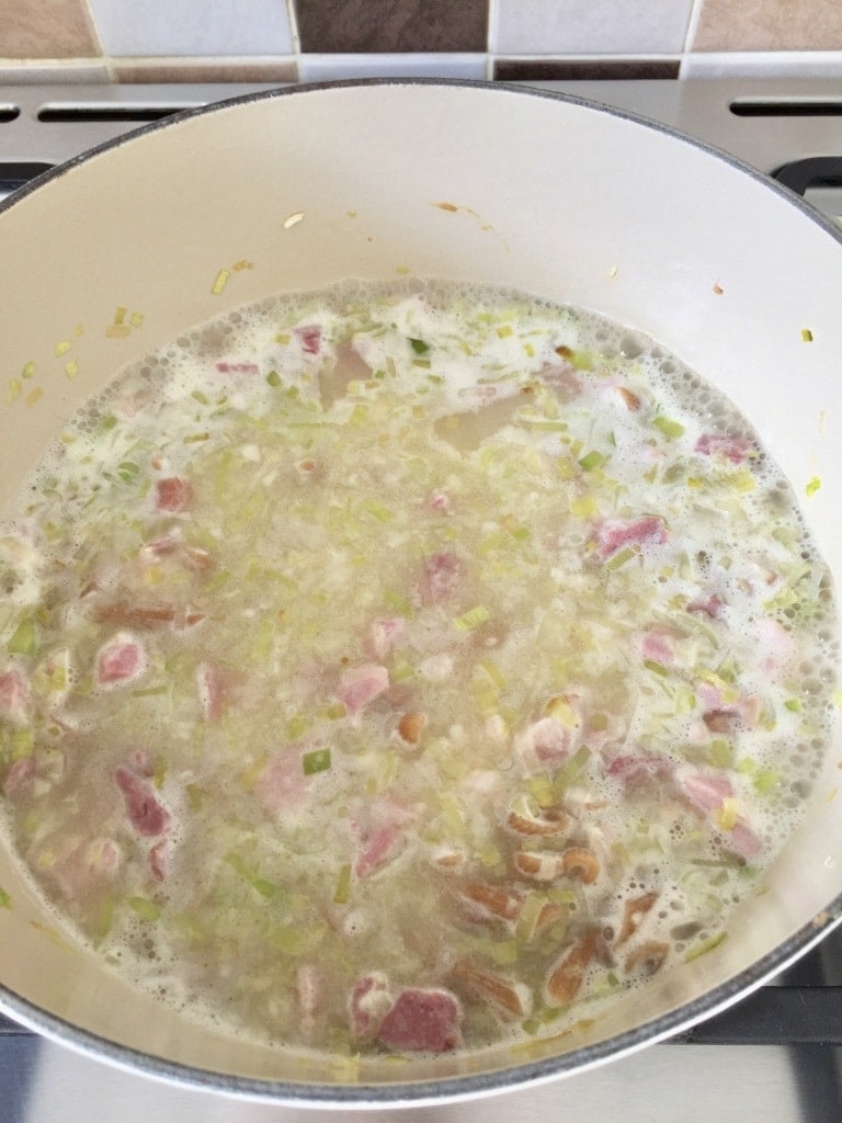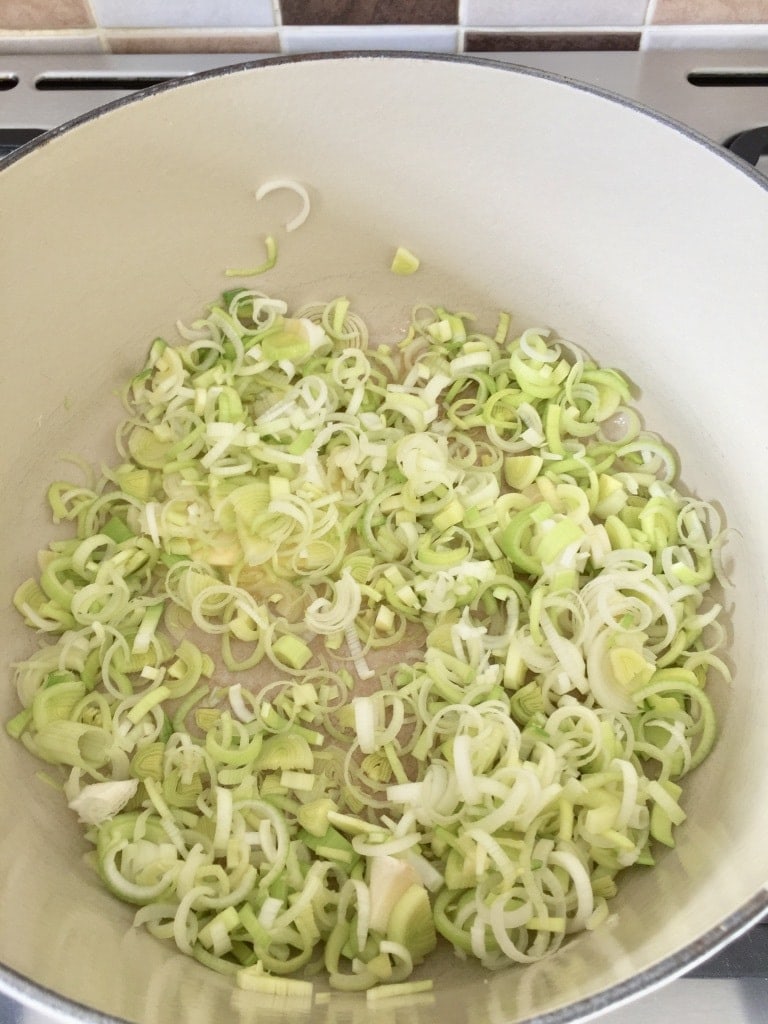 - Melt butter in a large, casserole style pot and add sliced leeks. Fry them gently on a medium heat until softened but not coloured stirring frequently approx 8-10 min.