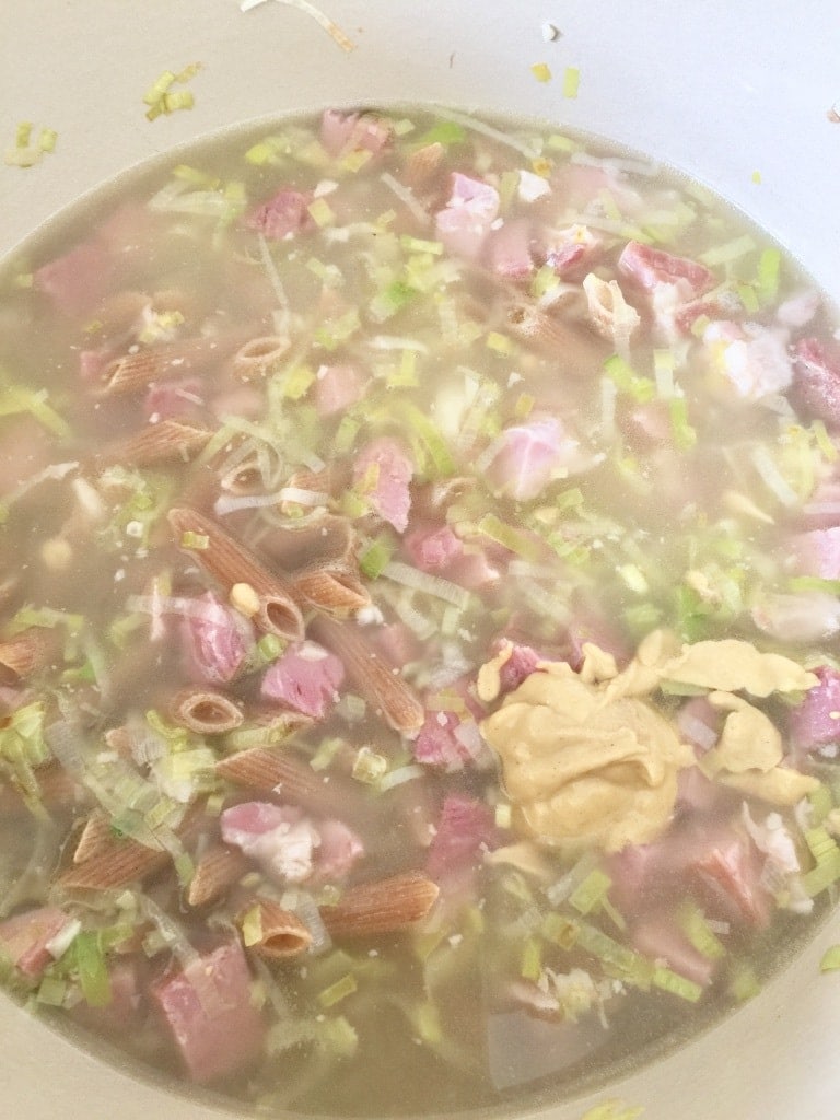 - Add pasta and ham followed immediately by ham poaching liquid or water and dijon mustard. Season to taste with salt and pepper.