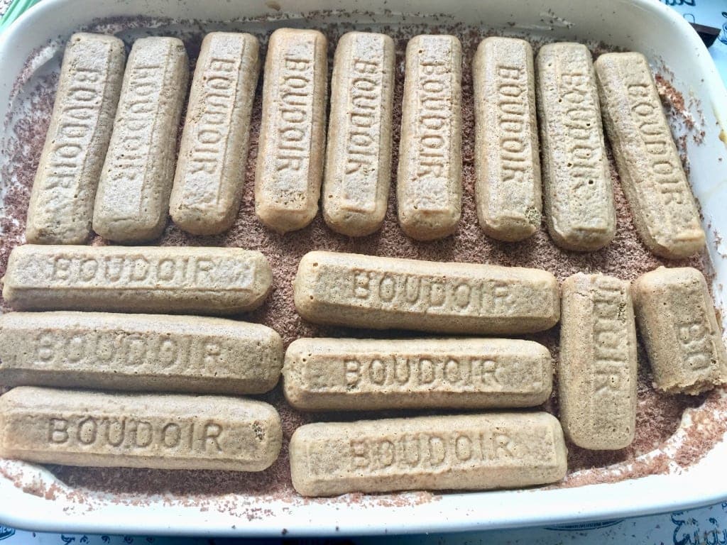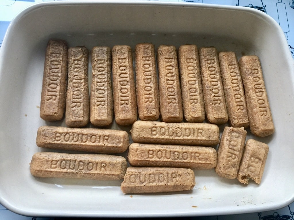 - Once your coffee has cooled slightly divide biscuits in half and dip them in it one by one. Let them "drink" the coffee a bit. You should use approx. 150ml / 10 tablespoon for each half of biscuits. Layer the biscuits at the bottom of the dish as you dip them in the coffee. If after dipping your biscuits you still have some coffee leftover (you used less than 150ml / 10 Tbsp) I would suggest to pour it gently over the biscuits using the spoon.