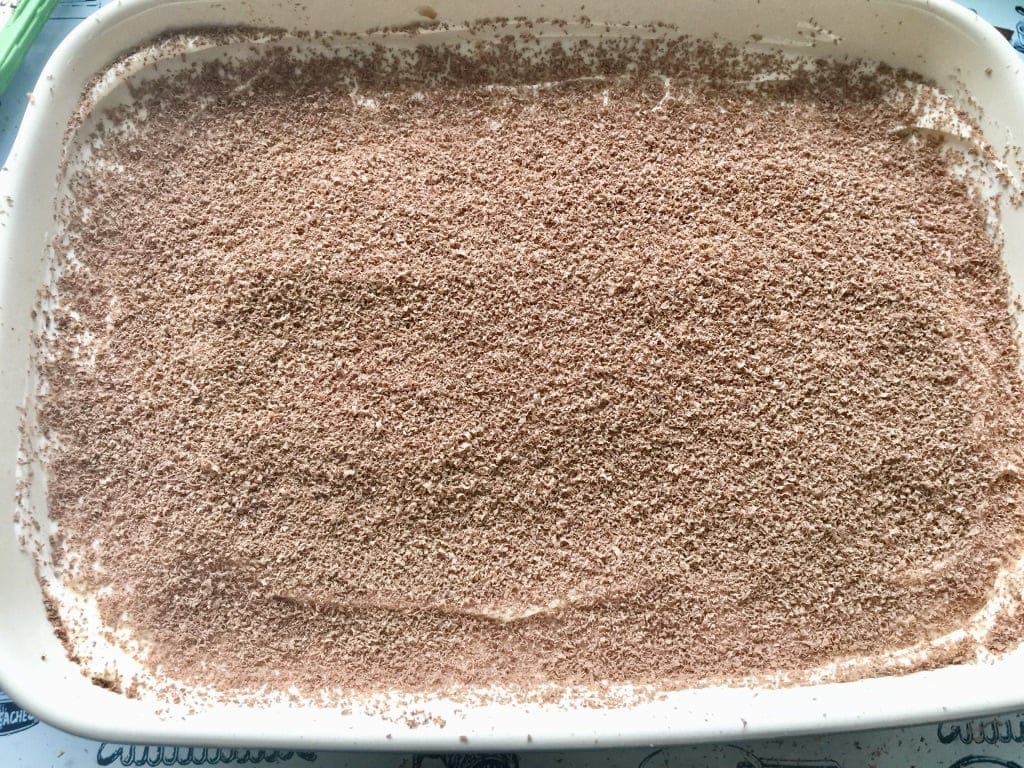 - Using fine microplane (or similar) grater, grate the dark chocolate squares over the mascarpone layer.