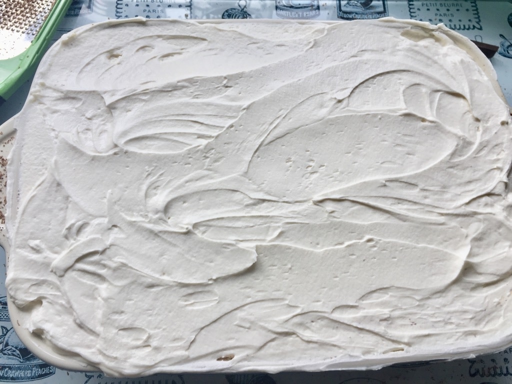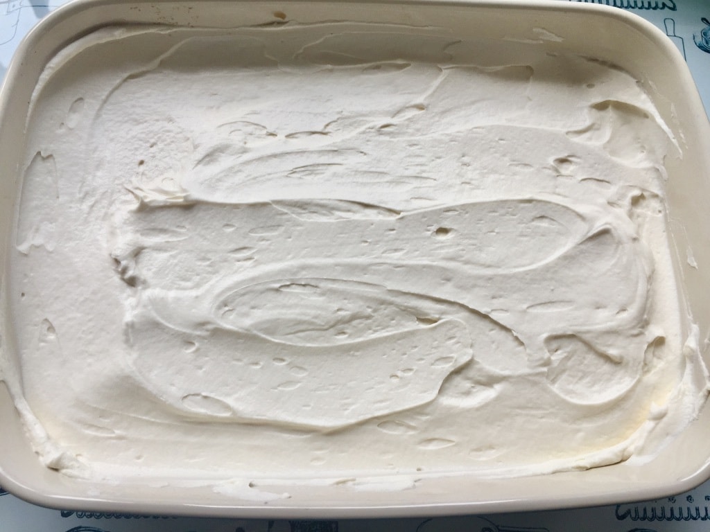 - Spread half the mascarpone mixture on top of the first layer of coffee soaked biscuits.