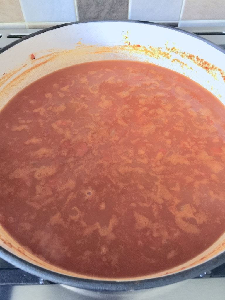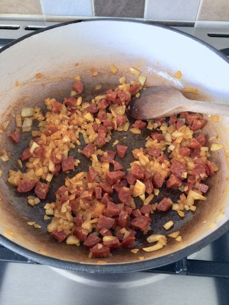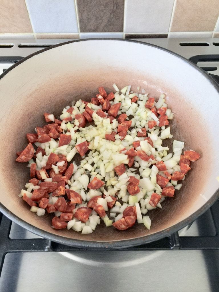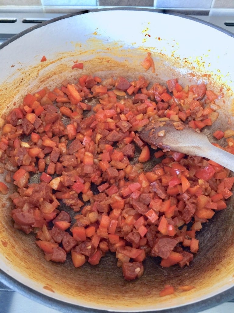 - Put a glug of oil in a large lidded casserole dish and throw in your chopped onion and chorizo. Let them sweat until the chorizo starts to release its lovely juices and onion starts to soften, around 8 min. Add chopped pepper, garlic, smoked paprika and sweat for another 5 min. Pour in the stock and add rice followed by chopped tinned tomatoes and good pinch of salt and pepper and stir well. Add a little bit of water to the empty tin of chopped tomatoes, swirl it around to get all the remaining tomato goodness and add it to your dish.