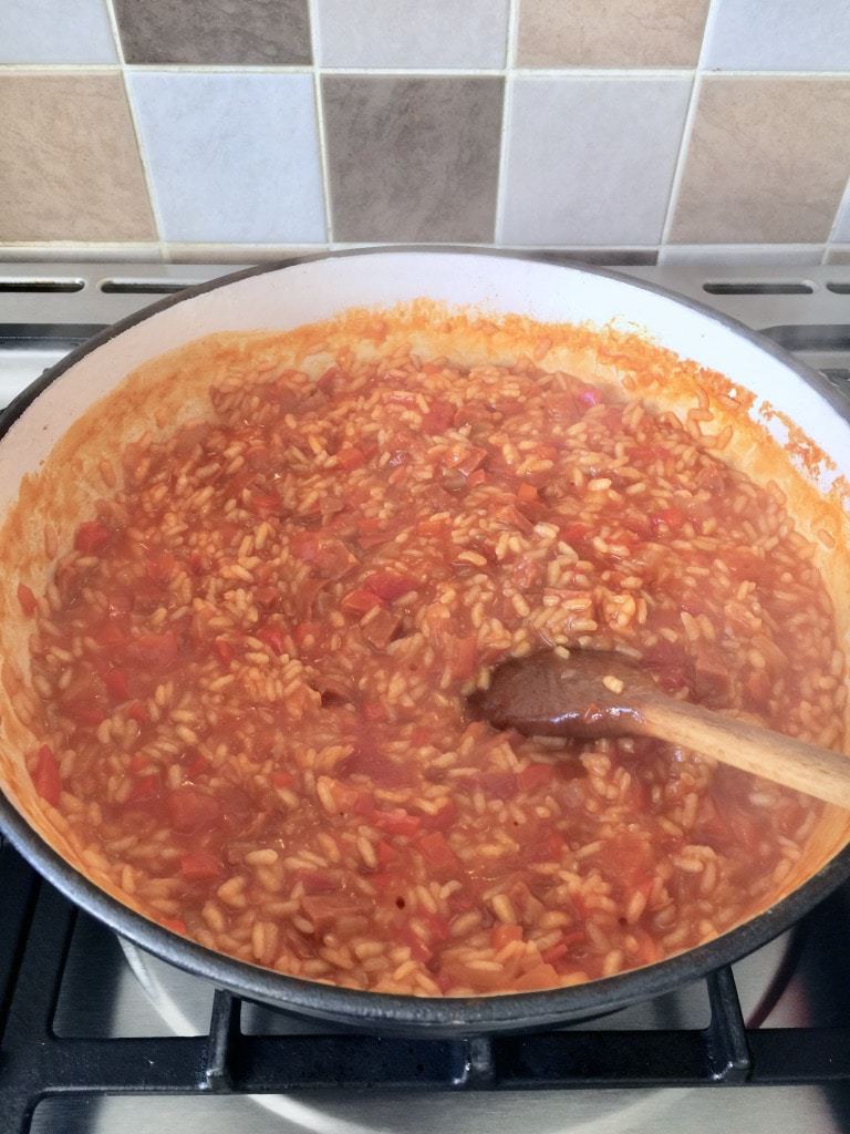 5. Bring everything to boil, lower the heat, pop the lid on and let it simmer for 15-20 min stirring on a regular basis as the rice will try and stick to the bottom of the pan. You might have to add a drop of water if your rice starts getting dry but is still quite al dente.
