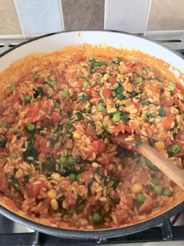 - Bring everything to boil, lower the heat, pop the lid on and let it simmer for 15-20 min stirring on a regular bases as the rice will try and stick to the bottom of the pan. You might have to add a drop of water if your rice starts getting dry but is still quite al dente. Add frozen peas and sweetcorn and cook another 5 min. Add spinach (if using) and stir well.