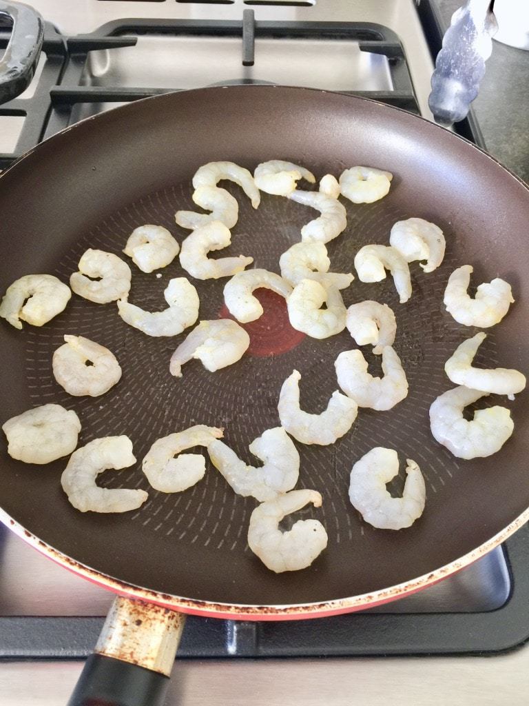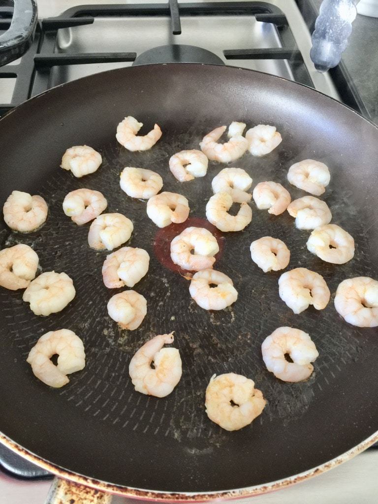 - Mix defrosted prawns in bowl with a bit of salt, pepper and rapeseed or olive oil and pan fry them in a dry non-stick pan (couple of minutes on each side until they turn pink in colour).