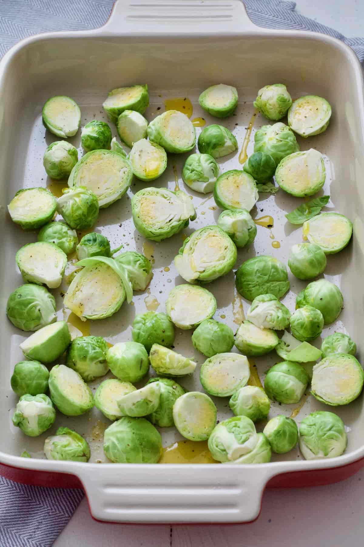 - Put prepared Brussels sprouts in a large baking dish or tin, season with salt and pepper and drizzle with your choice of oil. Give them a good stir to ensure that they're nicely covered with oil.