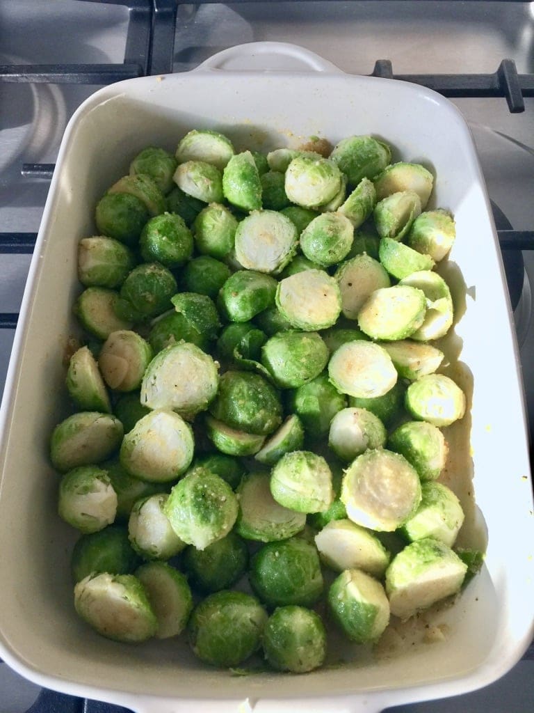 - Cut larger sprouts in half lengthwise leaving smaller ones whole and put them in a baking dish.