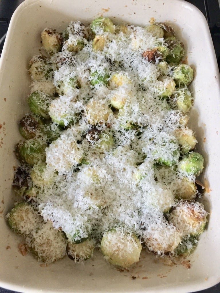 - Take the brussels sprouts out of the oven and give them a little mix. Grate as much parmesan as you like and sprinkle it over the sprouts. Return them into the oven for the cheese to melt and create lovely, almost lacy topping.