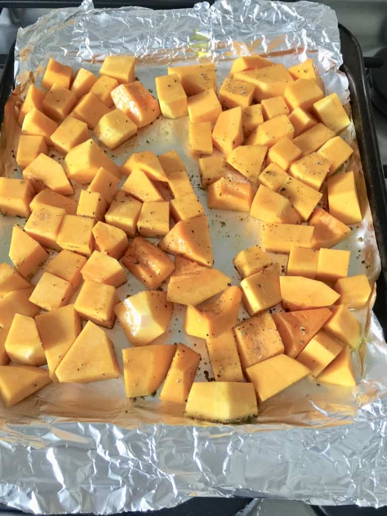 Easy Butternut Squash & Chorizo Gnocchi - chunks of butternut squash on the baking tray ready for roasting