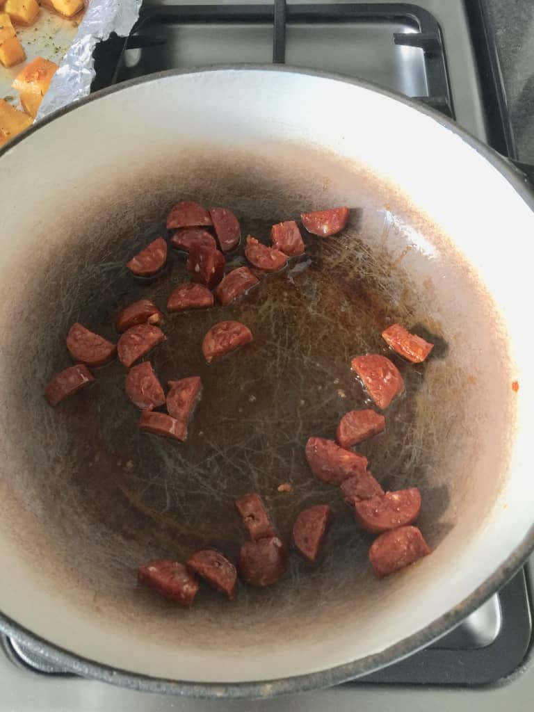 Easy Butternut Squash & Chorizo Gnocchi - pieces of chorizo frying in a pan