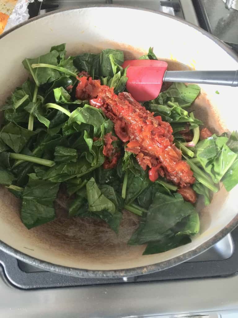 Easy Butternut Squash & Chorizo Gnocchi - fresh spinach and chopped sun dried tomatoes added to pan with chorizo