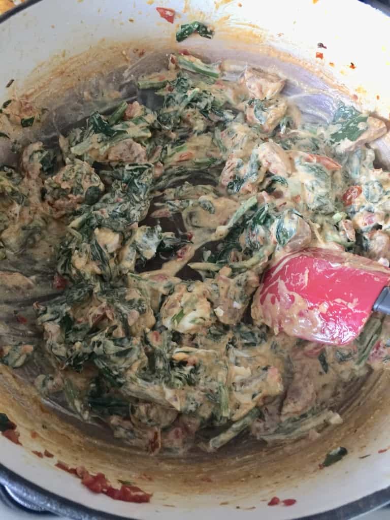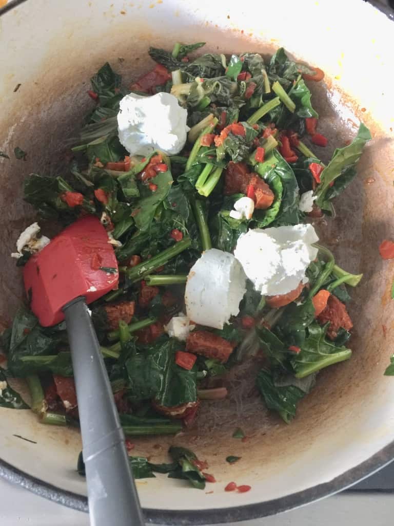 Easy Butternut Squash & Chorizo Gnocchi - soft goat's cheese added to the pan with spinach and tomatoes