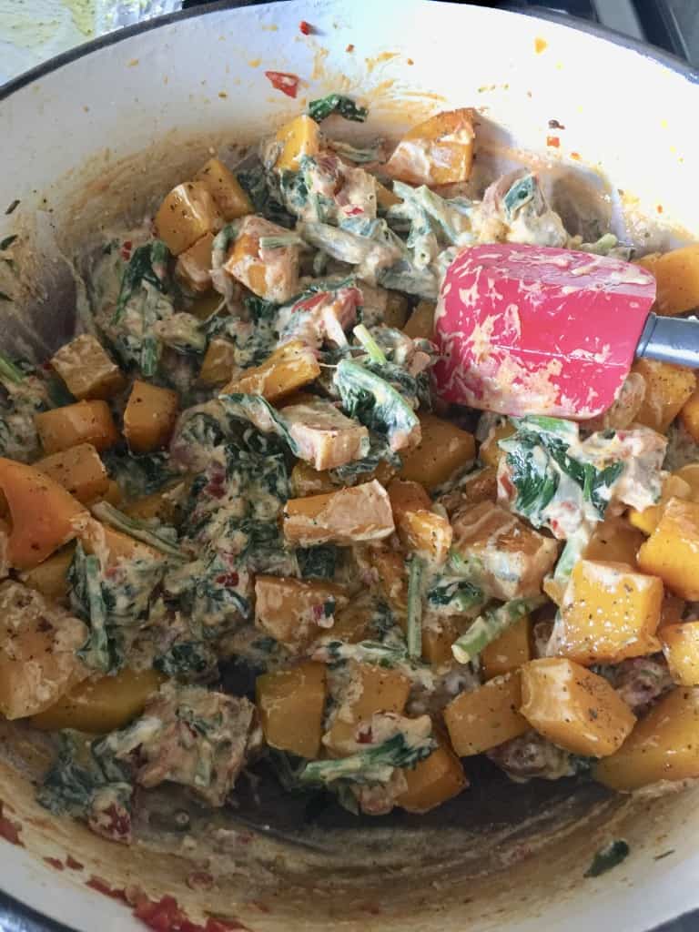 • Check on butternut squash and when ready add it to the sauce and mix in gently.