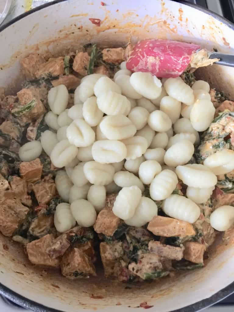 8. Follow with cooked gnocchi with a splash of cooking water to loosen up the sauce.