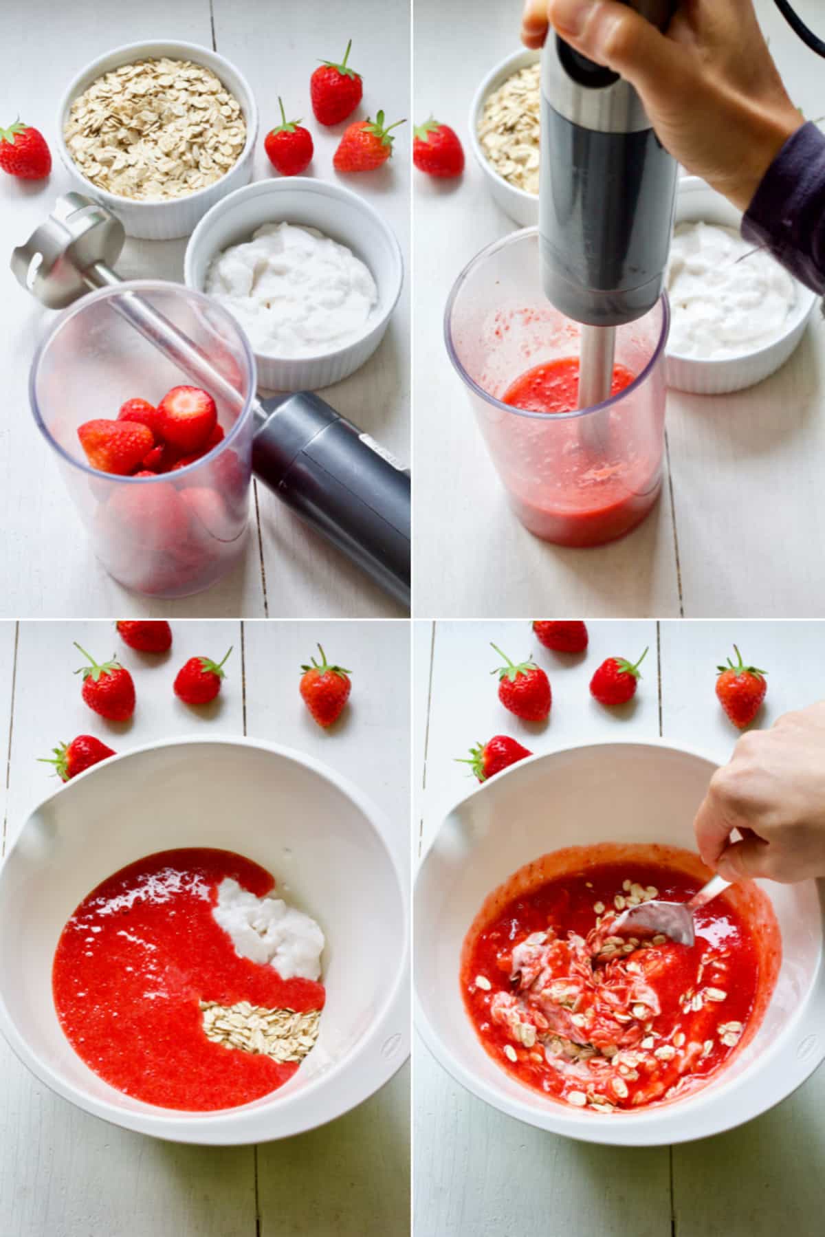 Three: Mix the oats, pureed strawberries and yogurt together in a bowl until well combined.